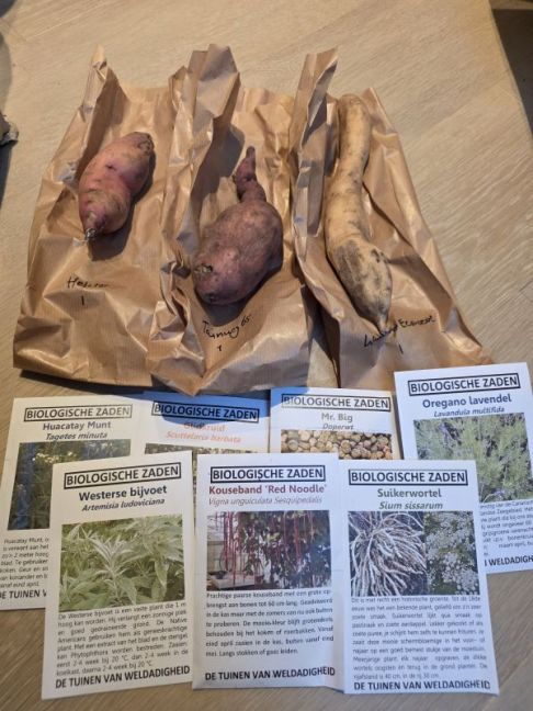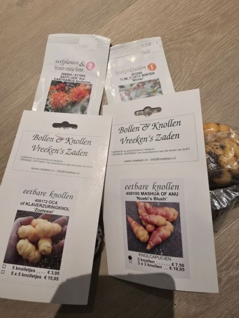 Was bij een klant in Dordrecht, aan de Voorstraat, dezelfde straat als Vreeken, alleen dan 200 meter verderop, dus even langs Vreeken geweest. Wilde eigenlijk zoete aardappel halen, maar die zagen er niet zo mooi uit. Dus die bestel ik wel bij de Tuinen van Weldadigheid, of anders bij De Oude Kastanje, alleen daar zijn de verzendkosten wat hoger (ik wilde ook Mashua hebben, die stonden bij Vreeken als niet voorradig, maar blijkbaar hadden ze toch 1 ras (wel erg duur, Oude Kastanje geloof ik 1 euro per stuk)). Toen ook maar gelijk Saffloer gehaald, mijn zaden waren op. En tijm, die moest ik nog hebben. Oca was al helemaal niet gepland.