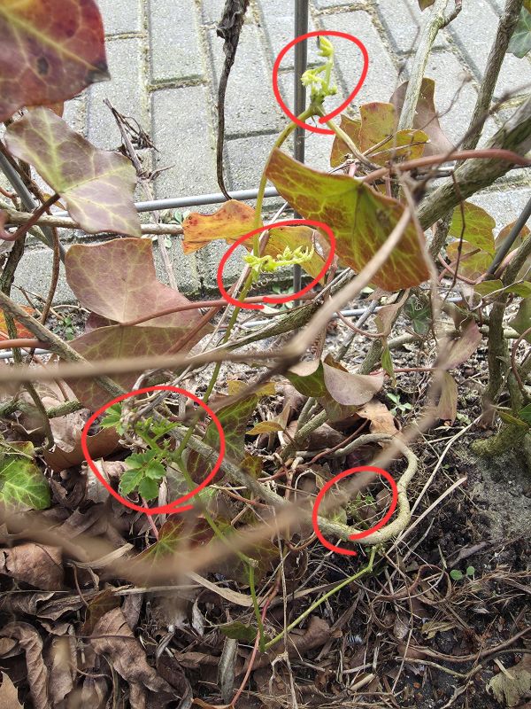 In Boskoop in de klei gaat de jiaogulan altijd in de winter dood, maar hier in Bodegraven (het is wel zanderig tussen trottoir en tuintegels) blijft die leven, inclusief stengel. En dat zonder winterbescherming. Nou ja, ik had er wat bladeren opgelegd, maar die zijn deels weggewaaid. En dat waren nog wel de wat mindere takjes die ik niet gestekt had. Een ander plantje in de rij idem. De rest moet ik nog even kijken, dacht dat ik er 3 had gezet.