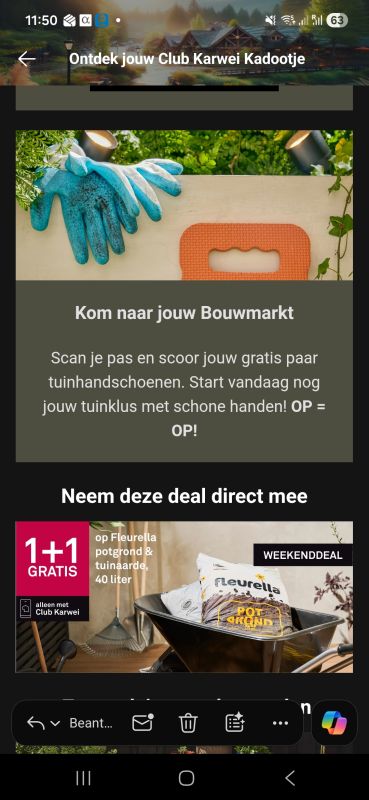 Op zaterdag een gratis paar tuinhandschoenen met de karwei pas en minimaal 10 euro besteding. Red je vast wel met 1+1 op potgrond.
