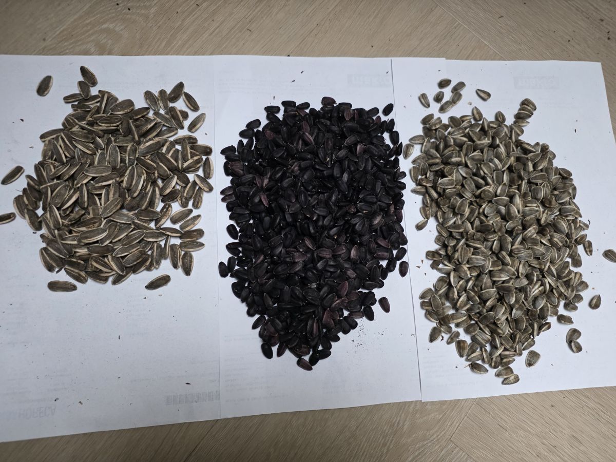 Wil de echte Turkse reuzenzonnebloem opstaan? Ik had zaden gezaaid, volgens mijn zadenlijst komen die uit de biozadendoos 2022. Ze zagen er zo uit als de linker. Van @Mellie ? Ik had zaad geoogst uit 3 verschillende bloemen, en alle 3 hebben ze ander zaad. Links, zoals gezaaid. Midden gedrongen en rijwel zwart, al hebben sommige zaden wel wat lichtere strepen. En rechts ook gedrongen en even groot als de middelste, maar dan in de normale kleur. De linker heeft al wat vogelvraat gekend, want die bloeide al wat eerder en deed de AH gaaszakjes er niet op tijd op. Zonder gaaszakjes waren ze al lang leeggegeten. Benieuwd wat dat later gaat opleveren.