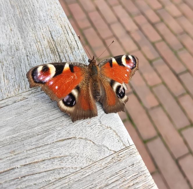 Vandaag was het belachelijk warm voor eind oktober. We zaten buiten met bezoek en er kwam er een prachtige dagpauwoog op tafel zitten.