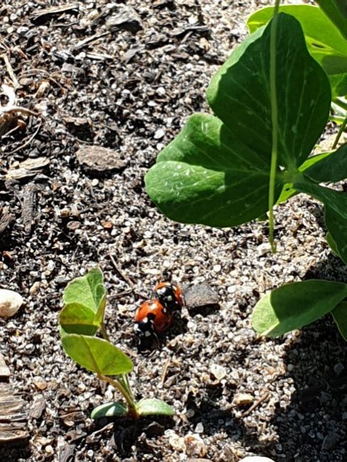 Luizen tref ik nog niet aan in de doperwten. De lieveheersbeestjes houden zich dan maar even bezig met andere zaken.- Nachtvorst