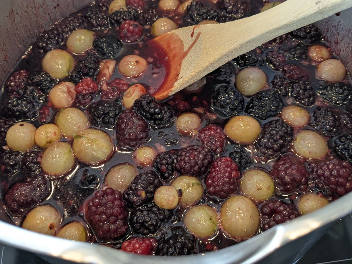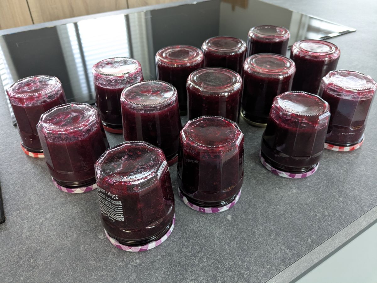 De jam was op, dus ik heb vanmiddag een nieuw voorraadje jam gemaakt. Deze keer bramen/kruisbessen, bramen/blauwe en zwarte bessen en rabarber/blauwe bessen.