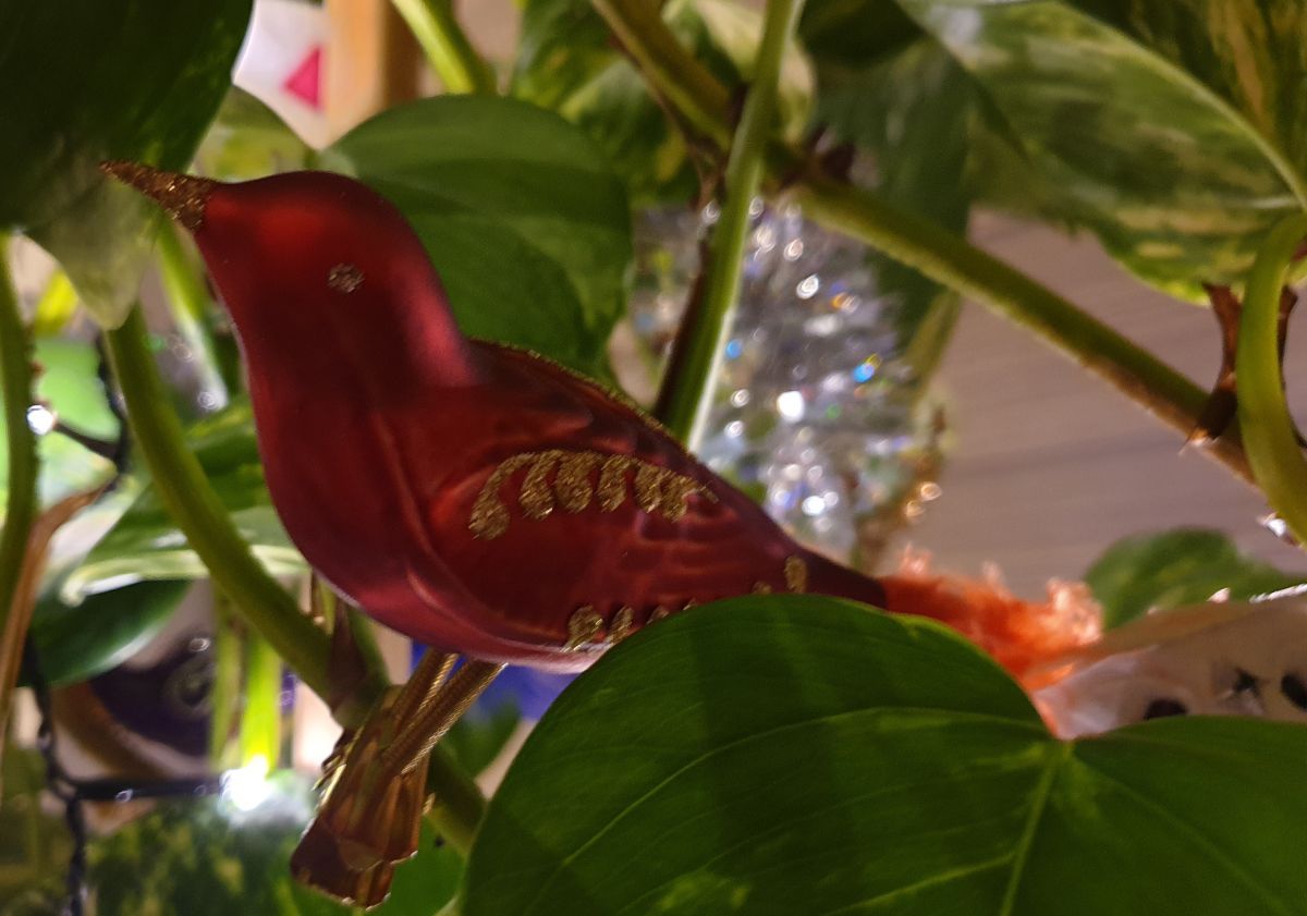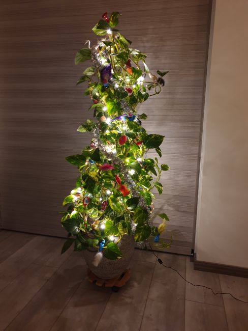 Ik wilde sowieso geen wegwerpboom, en zat na te denken hoe ik in ons nieuwe huis zou gaan versieren. Kwam.op een ochtend beneden en mijn wederhelft had onze grote plant versierd met lichtjes en kerstversiering. Zo lief, ik was helemaal verrast. Er zitten vooral vogeltjes in, en wat zelfgemaakt spul.