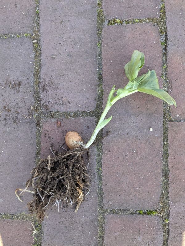 Doperwten en tuinbonen uitgeplant. Wat is zo'n plantje toch mooi! Boon, dikke wortel, heel netwerk aan dunne worteltjes, plantje. Ik kan me daar elk voorjaar weer over verwonderen.- Klaagbank #4