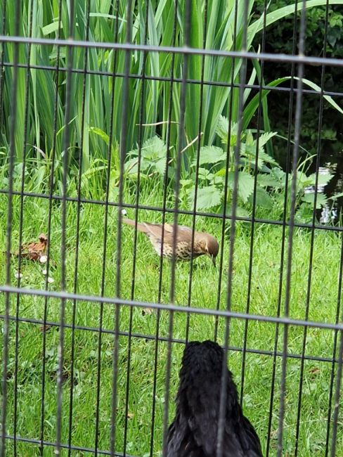 Hier zie ik sinds een paar dagen continue een zanglijster in de achtertuin. Niet een heel bijzonder soort, maar nog nooit eerder in de tuin gehad en nu continue met wormpjes in de snavel dus mogelijk een nestje in de buurt? Foto niet zo duidelijk want vanuit de kippenren genomen.