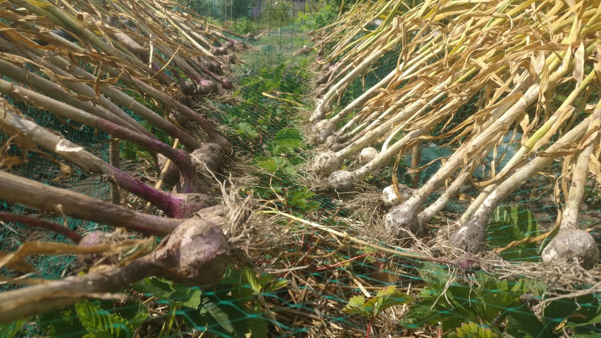 Even kijken naar de knoflook en toen per ongeluk beschadigd, dan maar oogsten. Valt me niets tegen in kleigrond. Wel duidelijk dat ze nog een 2 weken hadden kunnen groeien met de bollen. Deze heb ik bij de Lidl en was biologisch.