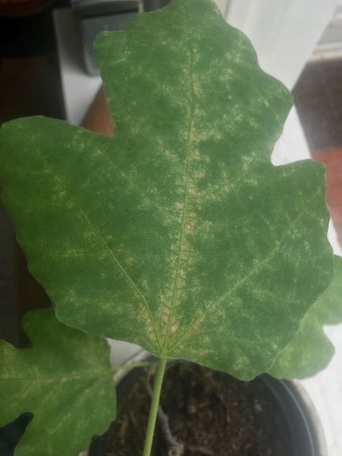 Sorry, hierbij de foto. Ik heb de stek binnen staan vanwege het seizoen. In mei gaat ie naar buiten.- Vlekken op vijgenblad binnen
