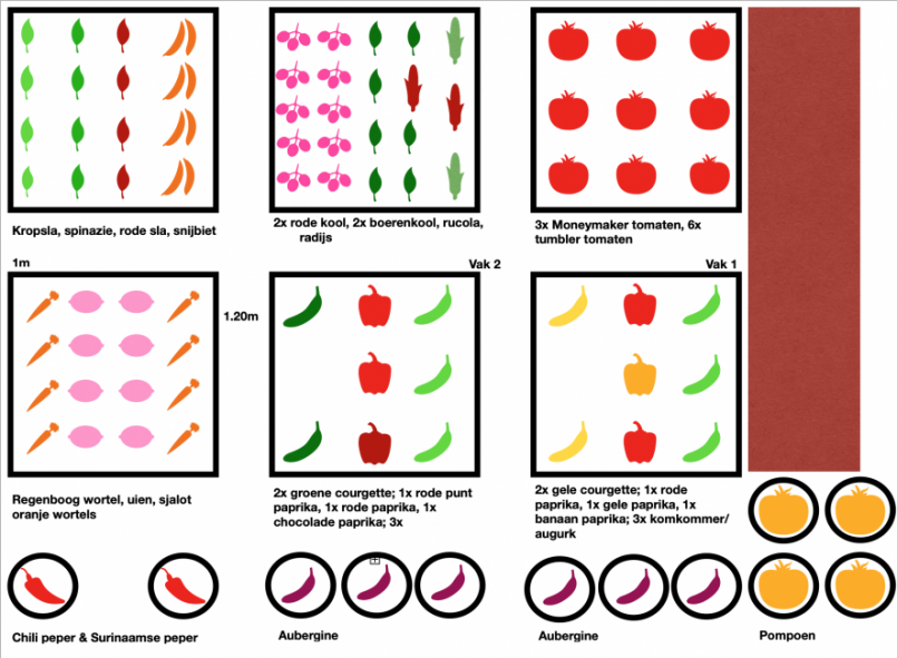 12. Hey iedereen! Ik ben alvast druk bezig met plannen maken voor volgend jaar en volgend jaar wil ik het toch anders aanpakken. Ik wil namelijk zes moestuinbakken gaan maken van palletranden van 120x100x40. Nu dachten wij zelf dat het handig is om onder deze palletranden nog een pallet te plaatsen waar wij vervolgens wieltjes onder doen. Maar toen bedacht ik mij opeens dat de planten dan natuurlijk niet verder kunnen wortelen dan die 40 cm. Daarom is mijn vraag dan ook; wat is handiger? Pallet eronder om zo de mogelijkheid te hebben op de bak makkelijk te verplaatsen of toch de palletranden neerzetten op aarde (zonder worteldoek dan, alleen op de randen)? Hier mijn moestuinplan zodat jullie kunnen zien welke plantjes ik wil planten: En denken jullie dat ik deze bakken ook voor een groot deel kan opvullen met compost van de gratis compost dag? Anders wordt het wel een heel duur grapje. Dankjewel!