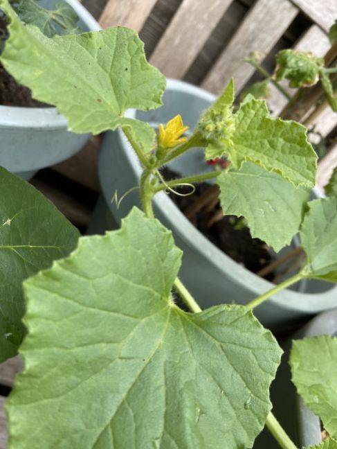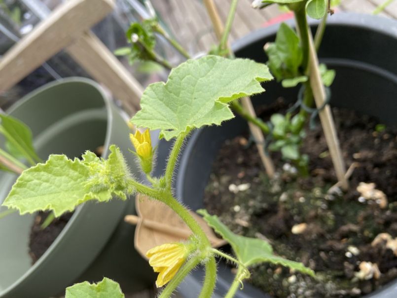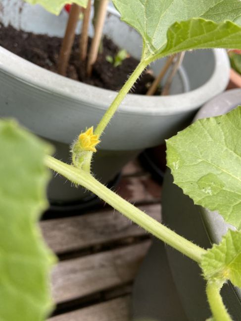 Wat ben ik blij dat ik potten gebruik. Deze wind hadden mijn jonge kwetsbare planten niet overleefd. Ze hebben daarom allemaal een beschut plekje gekregen: onder de tafel, in de schuur of tussen wat stoelen in. Voordat ik al mijn potten kon verplaatsen deed de stengel van mijn courgette knak.. Gelukkig heeft hij nog genoeg andere bladeren ;). Ik kocht gisteren ook deze Inca Golden Berry. Morgen de volle grond in! Mijn meloenplant groeit als een malle, helaas krijgt hij alleen maar mannelijke bloemen? Of ik zie het verkeerd.