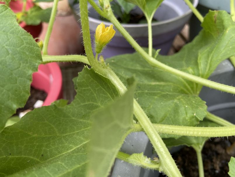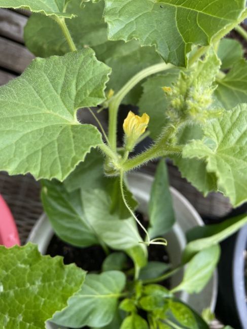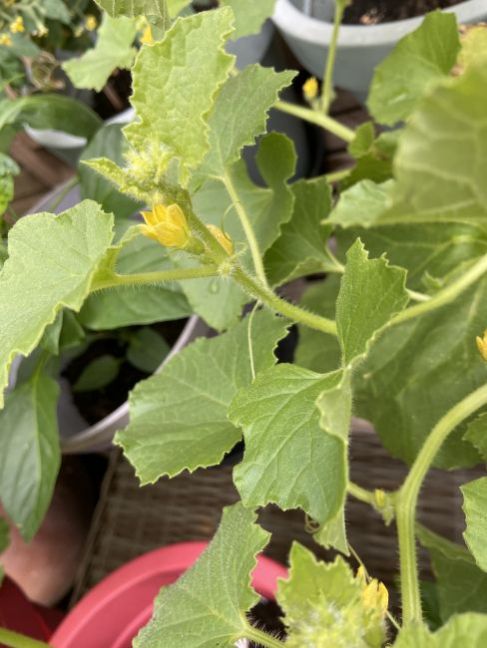 Tot nu toe zie ik geen kleine bolletjes, dus ik denk dat het tot nu toe nog maar alleen mannelijke bloemen zijn. Maar misschien binnenkort!