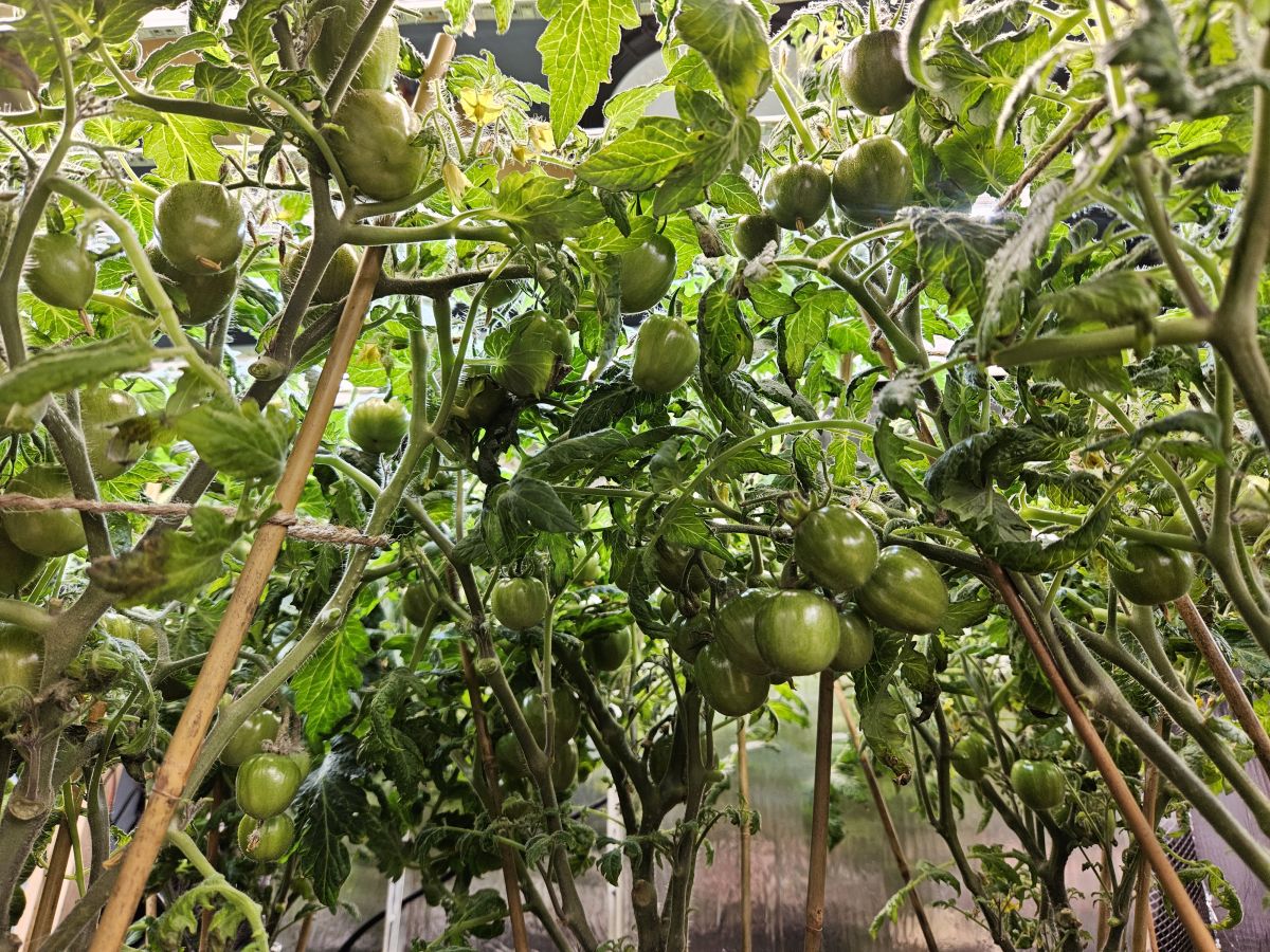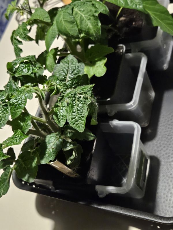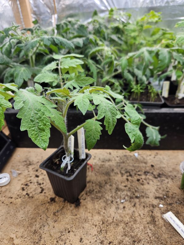 Deze blog hoort bij de start van een project met als poging om een zaadvaste viriele onderstam te creëren die resistenties vertoont tegen bodemziektes, er wordt gestart van een maxifort onderstam. Bij het selecteren en laten uitgroeien van nakomelingen van onderstammen is er een groot nadeel t.o.v. gewone tomaten. Die planten worden enorm groot en de vruchten zijn zo goed als oneetbaar, zoveel geschikte plaats kan ik bv daar niet aan opofferen in de tunnel. Om enig idee te krijgen om uit te selecteren, heb je minimum zo'n 25 tot 50 planten nodig. @ronald bezieler van het robuuste tomatenproject, kwam met een idee om dit te omzeilen, enten op een bruikbare tomaat, het topstuk van de onderstam bijhouden in een klein potje en indien de geënte bovenstam samen met onderstam succesvol is deze nadien te laten uitgroeien voor zaadwinning. Op deze manier is er geen verloren ruimte en moet je maar een paar geselecteerde onderstammen later laten uitgroeien. Een eerste vraag was dus vanaf wanneer kan je een onderstam doorsnijden en het bovenstuk wat je normaal weggooit laten doorgroeien. Ook moet je dan dit afgesneden stuk eerst wortels laten vormen in water of kan je dit kleine bovenstukje rechtstreeks in de grond steken. Als test heb ik hiervoor microdwarf Golden Hour gebruikt, deze blijven vrij klein, wat handig is voor binnen teelt in de winter. Onderstam F2 Maxifort en bovenstam Golden Hour zijn beide 26/10/2025 gezaaid. De planten zijn geënt 16/11/2025. 16/11/2025 Vlak voor het enten (links Golden Hour, rechts maxifort F2) Een week na het enten 23/11/2025. De boven en onderstam van de 3 plantjes zijn vergroeid en kunnen in normale luchtvochtigheid staan. 2 bovenstukjes werden water gezet om wortels te vormen en 1 rechtstreeks in grond. Van Golden Hour werden ook 3 niet geënte plantjes bijgehouden als vergelijk, deze waren op 23/11/2025 dan ook al een stuk groter als de geënte (ze hadden immers geen groeistilstand door het enten). Alle drie de bovenstukjes sloegen aan. En alhoewel het stukje rechtstreeks in grond het de eerste week wat moeilijker had, kreeg het de weken daarop een voorsprong op degene in water. Conclusie was dus in grond en water werken beiden bij een plantje vanaf een paar weken oud. Ik kies voor rechtstreeks in grond, het is minder omslachtig en sneller. Deze methode rechtstreeks in grond is in februari 2026 dan herhaalt op planten die later als eerste in de tunnel komen en was ook hier succesvol voor alle planten, ik zal deze dus ook gaan gebruiken voor al de planten die in maart worden gezaaid. Op foto: verschillende geënte planten in februari, ze staan telkens per paar, eerst het behouden bovenstukje van de onderstam maxifort F2 en dan de geënte plant. Helemaal rechts staan 2 planten die geënt zijn op F1 Maxifort als 0 referentie. Bij maxifort F2 kan je duidelijk een verschil zien bij de plantjes onderling. Maxifort F1 is wel degelijk niet zaadvast. De huidige stand bij de Golden Hour planten : Alle planten staan in 3l potten, dezelfde voeding en evenveel en op hetzelfde moment water gekregen. De niet geënte planten, de eerste vruchten beginnen rijp te worden. De rechtste plant is het meest beladen, maar is ook gestopt met groeien, nauwelijks nog bloemen en geen nieuwe vruchtjes. De middelste was getopt en loopt iets achter op de andere planten, nog een beetje nieuwe vruchtvorming. De linkse heeft de mooiste vruchtjes en ook nog wat vruchtvorming. De geënte planten. Ook hier beginnen de eerste vruchten te rijpen, er is geen achterstand meer. De vruchtjes zijn gemiddeld wel groter en de planten zijn nog volop nieuwe vruchten aan het aanmaken. De onderstam lijkt nauwelijks een invloed te hebben op de grootte van de plant, zoals verwacht, maar wel op de vitaliteit. De bijhorende onderstammen, ze zien er niet uit, maar ze kunnen dus gedurende lange tijd met minimale zorg levend gehouden worden, wat de bedoeling van de test was. Het is nu mogelijk om indien gewenst 1 ervan te laten uitgroeien om vruchten te vormen voor de F3 generatie. De selectie gebeurt dus nu op de volgroeide geënte plant en er is geen verlies aan plaats waarbij je normaal alle onderstammen moet laten uitgroeien. Een paar details van de geënte Golden hour planten. Vruchtgrootte, continue vorming nieuwe vruchtjes.