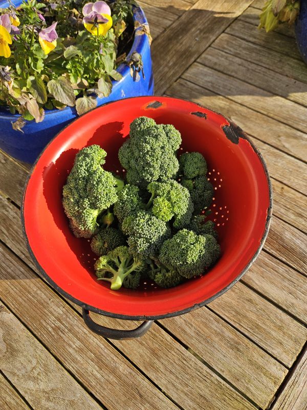 Broccoli voor winterteelt uit tunnel. Ik dacht gezaaid ergens september, de hoofdbloemaanzet was helaas verloren na de eerste strenge vorst. De planten hebben het wel goed overleeft en de zijtakken geven nu mooie roosjes.