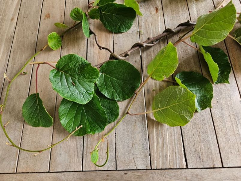Idem, ik denk ook kiwi(eventueel bes) om de reden hierboven vermeld, je ziet hem duidelijk krullen rond/klimmen in de 2de foto op de plant erlangs, als vergelijk wat voorbeelden van de takken van een kiwi hier.