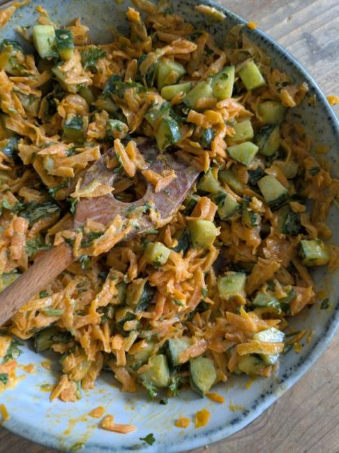 23. @Mellie vandaag de wortel klaar gemaakt volgens jouw recept. Was inderdaad lekker. 😉 Heb nog even wat creatieve vrijheid gebruikt en een halve komkommer en wat peterselie toegevoegd. 👌🏻En een half knoflookteentje, gewoon om even te wennen en te proeven. Had er trouwens tomaten bulgur van Ottolenghi bij gemaakt en soort gehaktballetjes op smaak gebracht met dezelfde soort smaken: komijn, paprikapoeder, knoflook, peper, zout en paar teentjes geraspte knoflook.