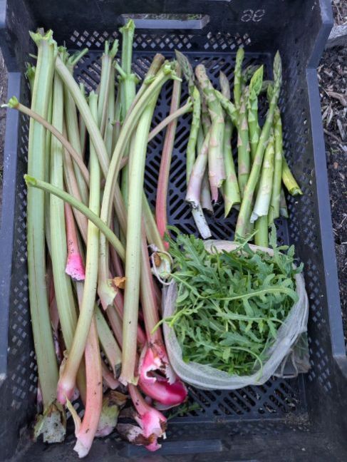 Voorjaarskratje. Rucola alweer aangetast door aardvlooien maar dat kan me niet schelen. Zonde om te laten staan, zo lekker scherp die wilde rucola. Heb een rabarber die nooit rood wordt. Bij het herinrichten van de tuin gaat deze eruit en een nieuwe rabarber erin. Red champagne of frambozen rood, nog geen keuze gemaakt. Tevens bloeit deze rabarber bijna jaarlijks dus dat is ook irritant.