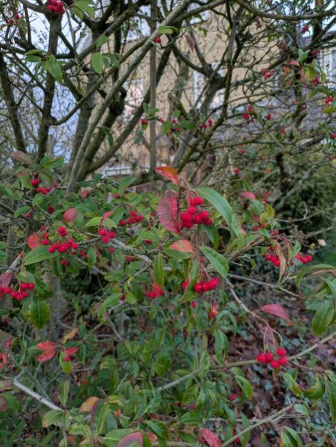 Deze forse, (half-)groenblijvende struik met rode bessen, iemand enig idee waar we mee te maken hebben? Vermoedelijk al zo'n 60+ jaar oud en vraag is even of het zin heeft om hier fors energie in te steken door mooi te snoeien etc. en dat kan ik alleen bepalen door te weten wat ik nu heb. 😅