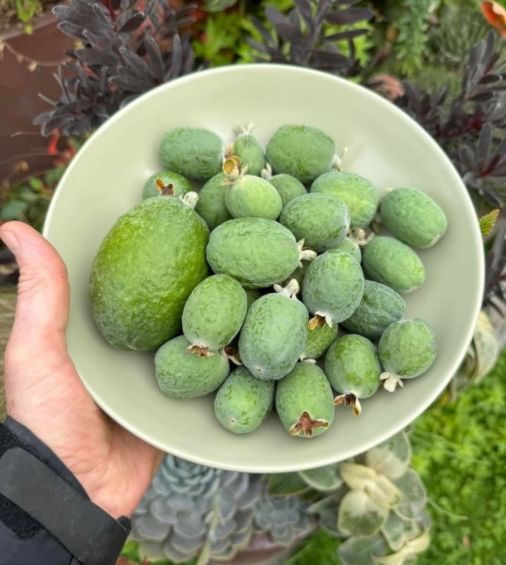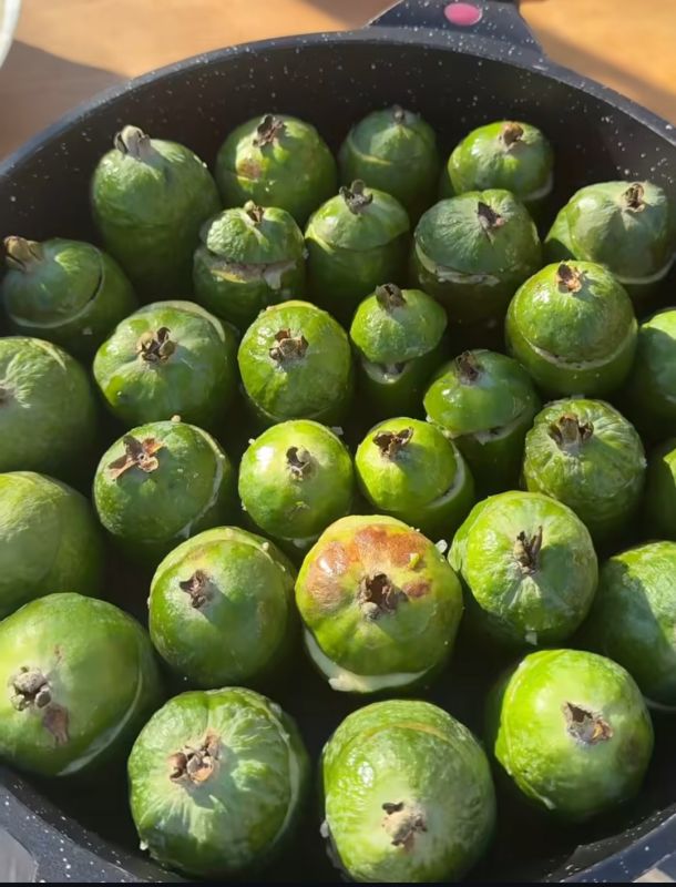 Even tussendoor twee ideeën om nog meer uit je feijoas te halen: https://youtube.com/shorts/Zx9L01A3NQc?si=C5KrbCwd8mxYv7LK Dit is een video van iemand die in een afgelegen berghuis in Noord-Turkije woont (regio Çayeli in Rize). Het vriest er amper, extreem vochtig jaarrond en warme zomers. The take-away: Kamèr gooit de iets bittere maar heerlijk geurende schillen niet weg, maar droogt ze om te gebruiken als smaakmaker in thee. Je hoeft geen Turks te verstaan om te zien wat hij van de geur vindt. In Turkije is de plant blijkbaar bekend als Kaymak Ağacı (Clotted cream tree). In Azerbeidzjan eten ze al generaties lang "Feyxoa", groeit door het hele land. Er is zelfs een oud recept "Feyxoa dolması" oftewel dolma (het vullen) van feijoa. In kort: 1) Grof lamsgehakt (of fijngesneden lamsvlees) (evt rund), gemengd met (bijna 2:1 verhouding) gehakte gele ui. Beetje verse munt. Beetje zout. Dit bereiden in een pan. 2) Feijoas uitlepelen en vullen met het bereide vleesmengsel. Het verzamelde vruchtvlees door de blender met flinke hoeveelheid Kaymak (of eventueel mascarpone) en dit over de gevulde pan gieten. Deksel erop en langzaam garen op laag vuur. Dit recept komt uit hun subtropische regio Länkäran. Feyxoa groeit ook landinwaarts, bijv in Ganja (max nachtvorst -7 ºC en droger dan NL. Tevens betere zomers). In de pan, alvorens saus: Op het bord, na bereiding: In beide landen is het ook gewoon om de vrucht (rauw) eventueel met schil en al te eten.