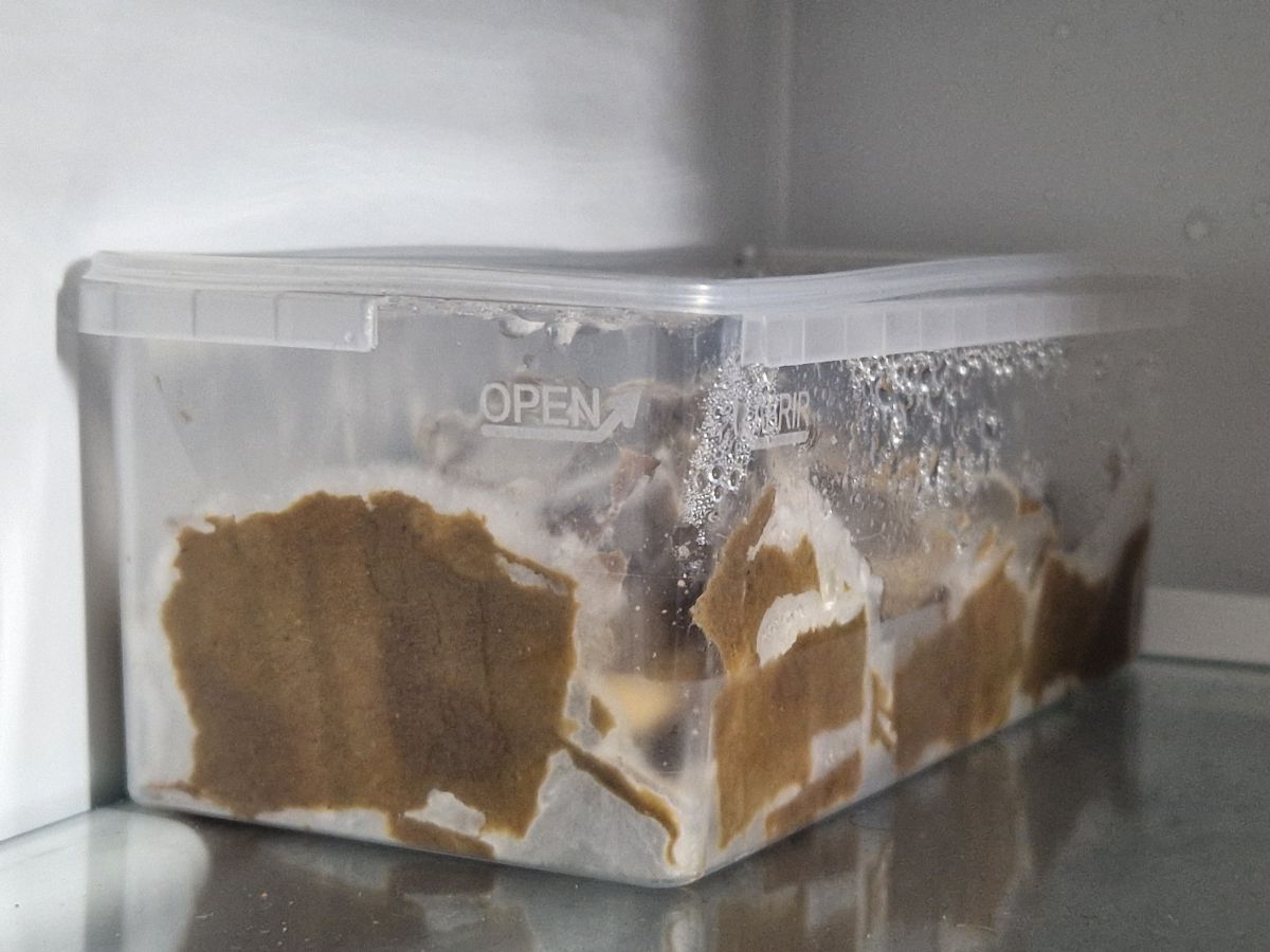 Ik had een leeg plastic snoepbakje van mijn kind, deze even gewassen. Hier wat kartonsnippers in gedaan. Kokend water erop, deksel redelijk dicht. Na afkoelen, afgegoten, en nog een keer en weer afgieten. Nu is het karton grotendeels gepasteuriseerd. Karton zelf is voor veel schimmels niet een prettig groeimedium. En toch de deksel zo min mogelijk open laten zodat er niet al te veel contaminatie uit de lucht bij komt. Met een schone vork heb ik de snippers nog wat uitgedrukt zodat ze niet te nat waren, daarna wat opgeflufd. Een paar oesterzwamstamreepjes (binnenste deel want schoon) er bij gedaan. Deksel dicht maar niet potdicht. 2 weekjes oid in een donker keukenkastje (het was ook warm toen). Af en toe checken dat de boel niet uitdroogt. Je zou misschien ook nat karton in de magnetron kunnen doen..let erop dat je ze als een donut legt, want het midden warmt nooit goed op. Eventueel halverwege wat roeren. Zolang het karton nat blijft, is er geen brandgevaar.