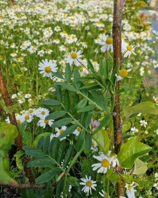 Ik had kamille uitgestrooid, blijkbaar ook wat op het terras gekomen. Heb enkele stevige bloeiende kamilleplantjes gehad tussen de tegels. Ondertussen wel verwijderd weer.