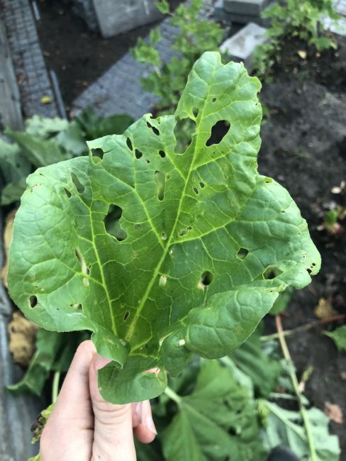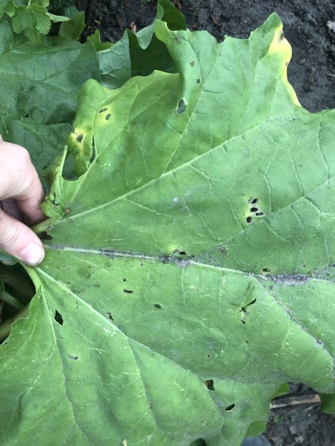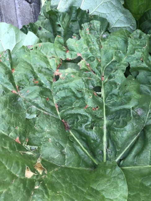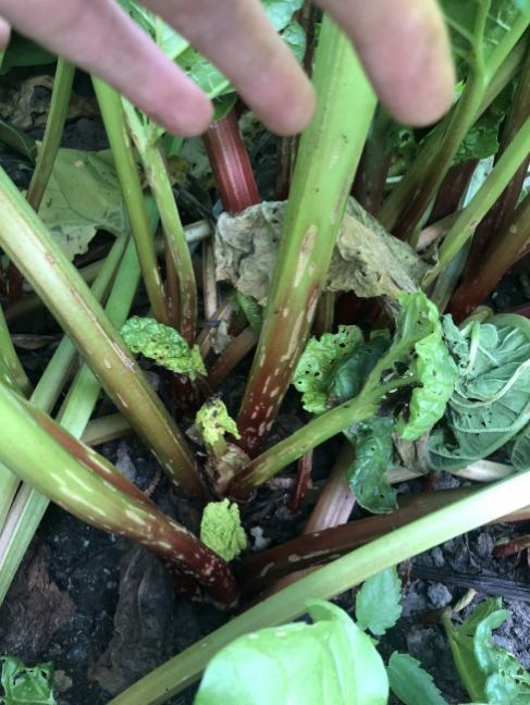 Hallo, mijn rabarberplant heeft sinds kort gaten in de bladeren en lichte plekjes op de stengels. Ook op de jonge scheuten. Hoe kan dit? En wat kan ik hieraan doen?
