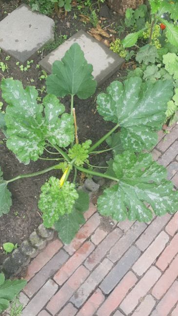 Mijn courgette plant ziet er raar uit, hij heeft overal witte/zilveren vlekken. Is dit meeldauw of hoort dit bij de plant het is een "Gold Rush F1" ras trouwens.