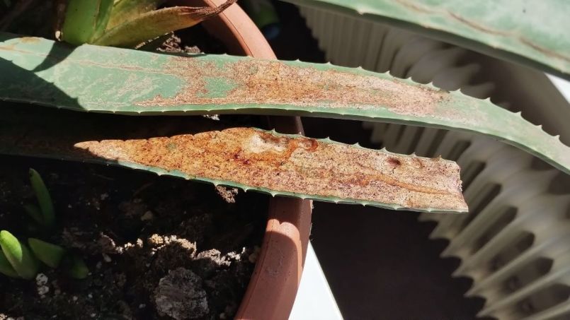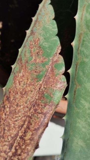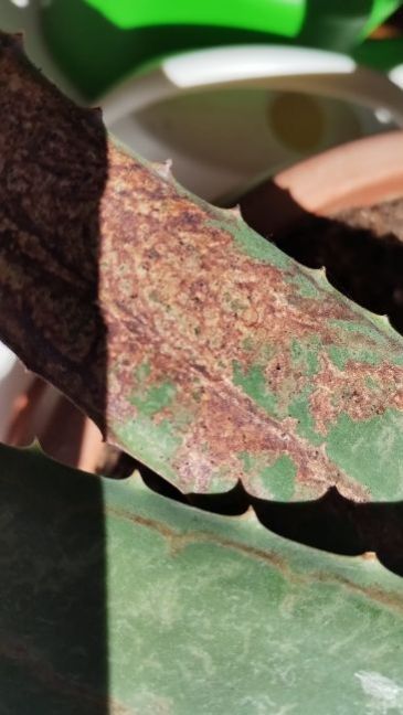 Ik hoop dat dit de juiste plek is om deze vraag te stellen aangezien het geen moestuin vraag is, maar er zit aanslag op mijn aloë vera. Eerst dacht ik dat het iets te maken had met mest of water na het verpotten, ook hebben er wat slakken op gezeten dus wellicht afgestorven oppervlakte, maar nadat ik van de week eens goed ging kijken was het echt een laag op het blad en heb ik het idee dat het roest is. Heb gezocht, maar kon niet echt uitsluitsel vinden, kreeg veel links van bladvlekken, maar dat is het zeker niet, het is echt een laag op de plant die je vast eraf kunt vegen, maar dat heb ik voor nu nog maar niet geprobeerd. Zag ergens een advies om het schoon te vegen en formaline te gebruiken, maar dat weet ik ook niet, ik weet uit ervaring hoe smerig dat spul is en denk dat ik dan beter die hele plant in de groene bak kan gooien en een paar nieuwe kan kopen. Zitten overigens diverse pups onder waarvan er verschillende net hun kopje boven het zand uit steken, wellicht dat die nog niet aangetast zijn en dus nog te redden zijn. Ik denk er dus over om alle bladeren met aanslag weg te snijden en de pups in een nieuwe bak te zetten om te zien of ze het redden. Iemand een (betere) suggestie?