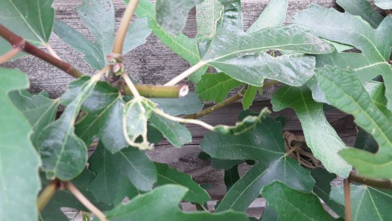 Mijn broer was op bezoek en constateerde dat behalve in zijn tuin ook bij bij de vijgenmot in mijn 2 soorten vijgen zit. Vorig jaar gesignaleerd bij Eijsden en nu dus op de lijn Venlo-Eindhoven. Ik dacht dat deze mot alleen in zuidelijke landen zat .... maar zoals ook de buxusmot en processierups trekt deze vijgenmot dus steeds verder naar het noorden. De mot (klein oranje) zelf heb ik niet gezien, mijn broer heeft 'm wel gespot. Wel heb ik rupsjes en lichte schade (foto's) aangetroffen. Op de foto is te zien waarom de mot ook vijgenskeletteermot wordt genoemd. Bestrijding schijnt moeilijk te zijn, dus elke paar dagen checken en rupsen doodmaken.