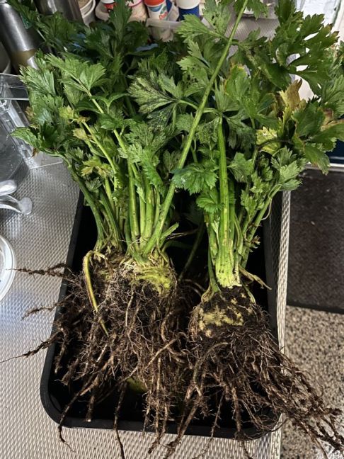 Zo heeee, wat een joekels! Ik haalde mijn laatste vier knolselderij uit de grond. Ze zijn formaat zeer forse tennisbal. Niet heel groot, de iets grotere waren er al uit. Maar ze zijn zo ongelooflijk lekker. Zulke lekkere knolselderij at ik nog nooit.
