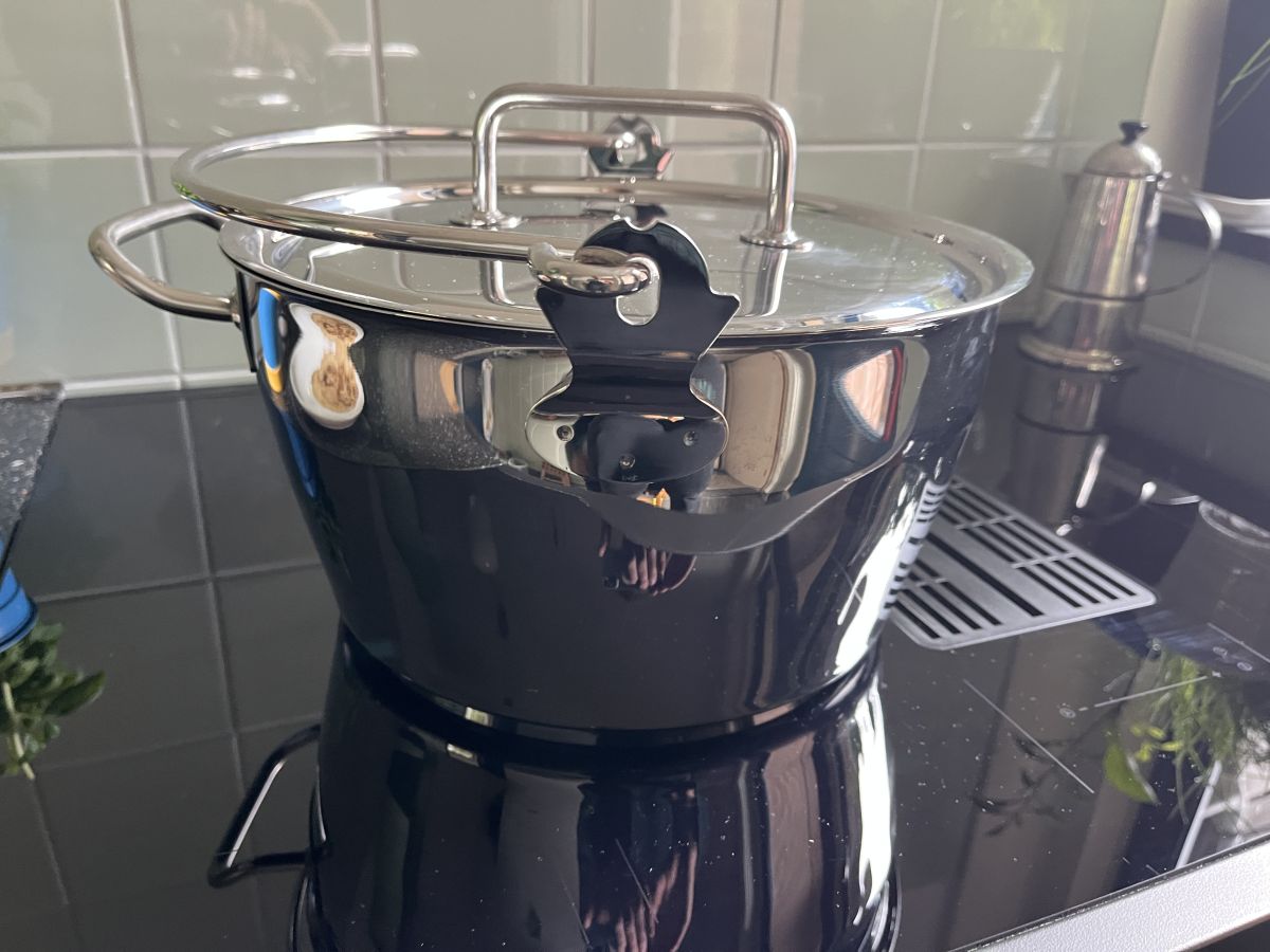 Ohhh ik kocht zo'n mooie jampan. Ik kreeg een VVV-bon en had nog verjaardagsgeld, en toen kocht ik hem zomaar. De oude deed het helaas niet meer in onze nieuwe keuken op het inductiefornuis. Dat was ook een hele fijne pan, ook 10 liter, maar dan iets smaller een hoger. Met deze kan je fijn gieten. Hier gaan heel veel jammetjes uit komen.