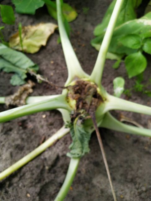 14. Ik heb dit jaar een slecht kooljaar. Veel kool rot bovenaan. Vooral rode kool en koolrabi. Ik heb twee foto's bijgevoegd. Wat is hiervan de oorzaak en is er in de toekomst nog wat aan te doen?