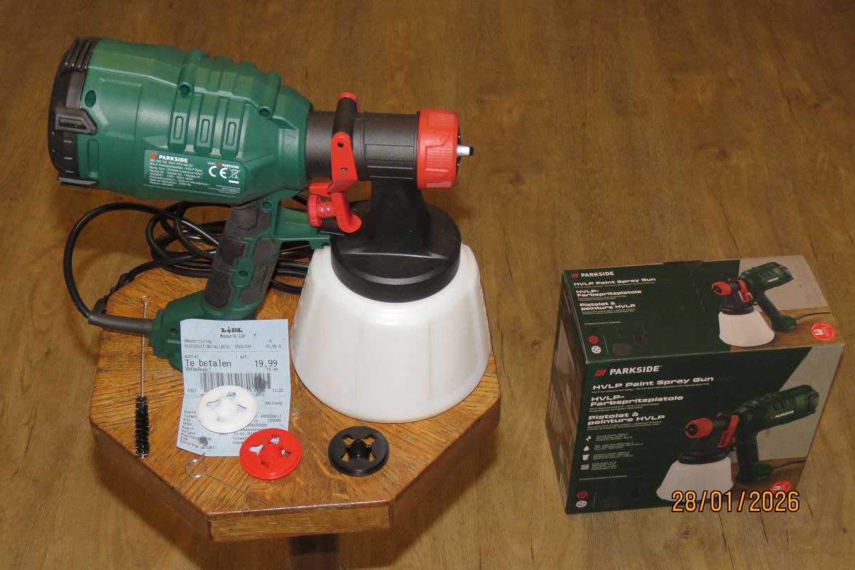 Een geheim (nu niet meer ) wapen gekocht in de strijd tegen de zwarte bonenluis. Ik zet ieder jaar veel tuinbonen en ook dit jaar krijg ik er gegarandeerd weer mee te maken. Bestrijden met een oplossing van spiritus, groene zeep en water werkt goed mits je die krengen overal goed raakt want anders helpt het onvoldoende. Tot nu toe gebruikte ik zo'n handbediende drukpomp van Lidl of Action maar het blijft behelpen want je moet ook goed onder de bladeren kunnen spuiten en snel gaat het niet. Gisteren kwam ik dus bij een belgische Lidl mijn nieuwe wapen tegen en dat ook nog eens voor het zachte prijsje van 19.99 euro (in de solden zoals de Vlamingen dat zo mooi zeggen). Verf zal er nooit mee gespoten worden en dat is ook niet de bedoeling. Hij heeft 4 verwisselbare sproeikoppen die ook nog eens in 3 patronen kunnen spuiten. De doorstroom (hoeveelheid te verspuiten vloeistof per tijdseenheid) kan ook nog eens ingesteld worden. Gelijk thuis met water geprobeerd en het resultaat is wat ik er van verwachtte. Laat die zwarte bonenluis maar komen. Op accu was het nog beter geweest maar een verlengsnoertje is zo gelegd en anders gebruik ik mijn aggregaatje.- Action