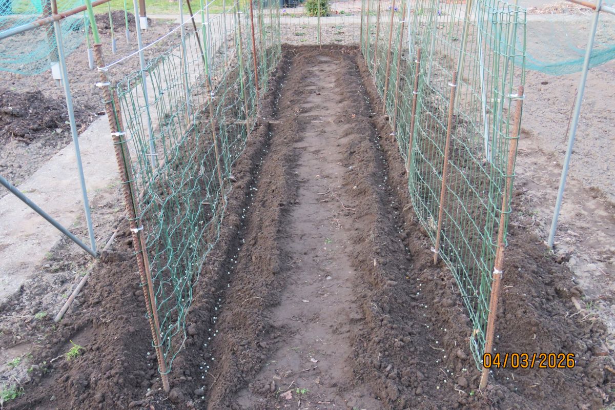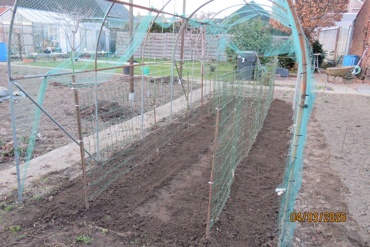 Vanmiddag de erwten gezaaid. Ze zijn van het ras Vada dat ik al vele jaren teel en waarvan ik ieder jaar nieuw zaadgoed voor het daaropvolgend jaar over hou. Zoals ieder jaar staan ze in 4 rijen langs gaas in een 6 meter lange nettenkooi die bescherming gaat bieden tegen kauwtjes, houtduiven en mussen. Kauwtjes die ze uit nieuwsgierigheid uit de grond trekken zodra ze boven de grond komen en houtduiven die ze opgraven zodra ze door het werk van de kauwtjes tot de ontdekking komen dat er erwten onder de grond te vinden zijn. Mussen worden weer later een plaag. Gedurende de bloeitijd vreten ze aan de vruchtbeginsels wat ten koste gaat van de hoeveelheid te oogsten peulen terwijl ze in een later stadium ook wel een vers doperwtje lusten. Na het trekken van sleuven aan weerszijden van het gaas strooi ik er de erwten in. Met de onderlinge afstand komt het niet zo nauw dus dat gaat lekker snel. Veel belangrijker dan onderlinge afstand is dat de grond lekker los is zodat de plantenwortels straks zijdelings makkelijk hun weg kunnen vinden. Na het dichttrekken van de sleuven is er behalve het aanbrengen van het net voorlopig niks meer te doen. I.v.m. vruchtwisseling zet ik ieder jaar de kooi op een andere plek maar door omstandigheden is daar vorig jaar niets van terecht gekomen. Het was niet te merken aan de oogst die wat kwaliteit en volume betreft zeker niet onder deed voor andere jaren. Om nu een derde jaar op dezelfde plek erwten te telen is echter de goden verzoeken maar toch gaat dat gebeuren. Ook dit jaar heb ik wat minder tijd voor de tuin zodat de kooi op zijn plek blijft staan. Wel heb ik in verband hiermee extra veel eigen compost ingegraven. De teelt van dit jaar zie ik nu vooral als een niet gepland experiment dat aan zal tonen in hoeverre je ongestraft meerdere jaren achtereen erwten op dezelfde plek kunt telen.