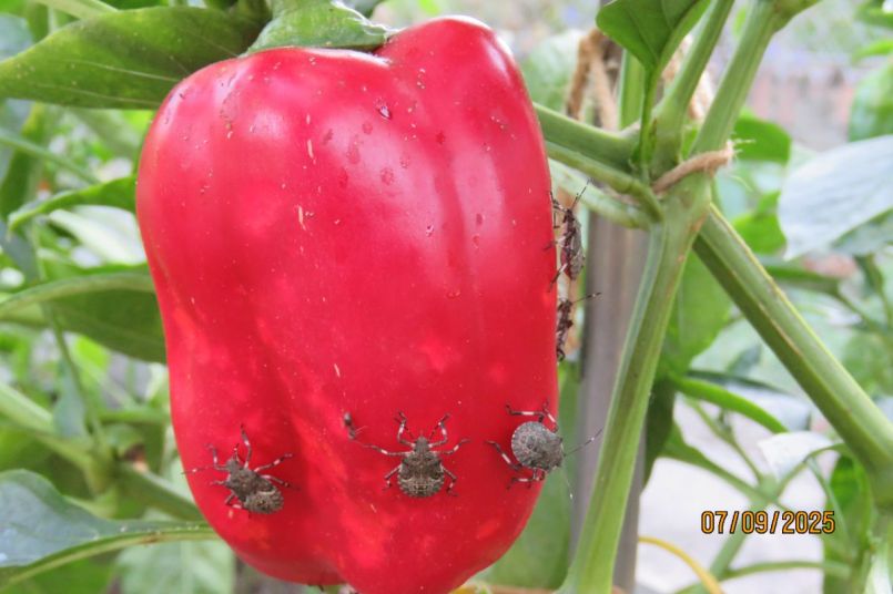 Al wat grotere nimfen van de groene schildwants. De foto's zijn van 5 dagen geleden maar ondanks het regelmatig wegvangen sindsdien ben ik er nog steeds niet van af.