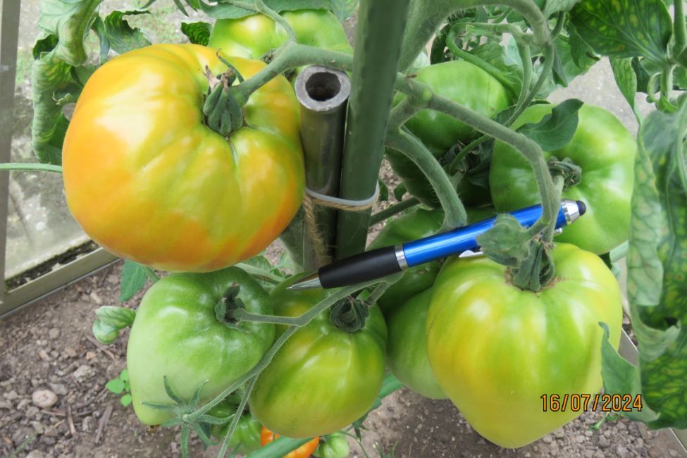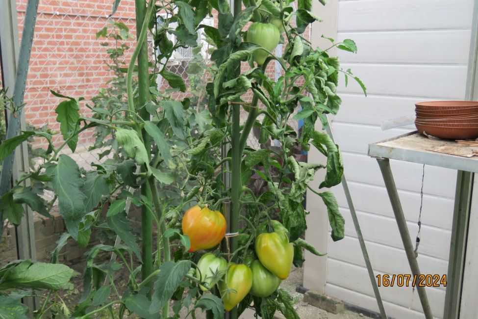 In de kas is de groei rond de stokken goed op gang gekomen. Aan de andere kant van het pad zijn nog 2 planten gezet. Van deze twee begonnen na een paar dagen bladeren te krullen. Ze bleken besmet te zijn met hele kleine grijs/groene luisjes wat enige moeite kostte om kwijt te raken. In de vollegrond werd de groei vertraagd door de nog koude nachten en ook hier bleken kleine grijs/groene luisjes aanwezig te zijn. De ontwikkeling van nieuwe gezonde bladeren komt maar langzaam op gang maar ze hebben nog alle tijd. We zitten tenslotte pas in mei.- Teeltwedstrijd 2025 Aubergine Golden Egg