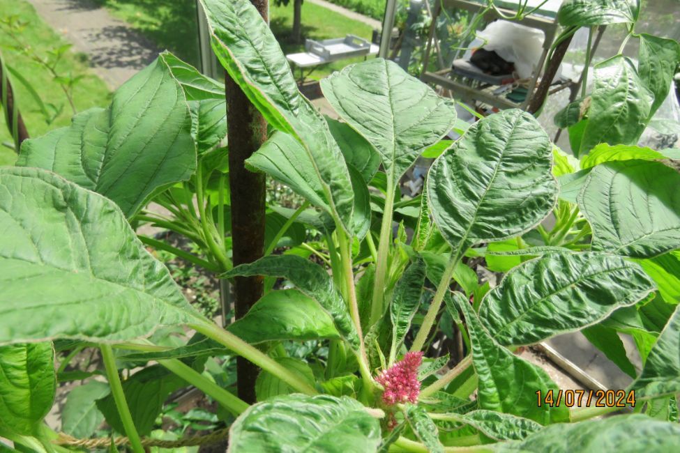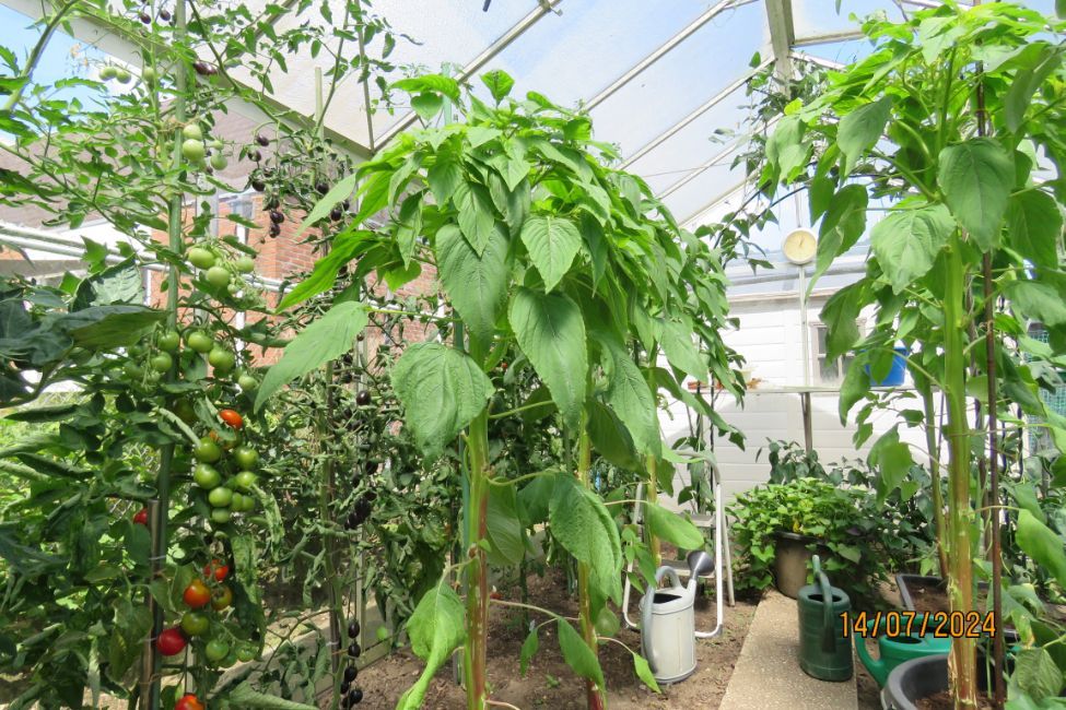 De eerste planten hebben de top van hun stokken bereikt, zitten tegen het glas aan, en zijn nu ongeveer 2.4 meter hoog. Bloemen zijn er nog niet maar bloemknoppen zijn volop aanwezig. De bedoeling was de planten via draden verder te laten groeien naar de nok van de kas maar ik heb me bedacht. Kouseband groeit namelijk niet uit zichzelf schuin omhoog (ze zijn geprogrammeerd om verticaal te groeien) dus dat laatste stukje zou ik de planten moeten leiden. Allemaal extra werk op een laddertje en dat voor een beetje extra plant. Ik heb besloten om zodra het glas van het dak bereikt wordt hun toppen (groeipunt) te verwijderen. Ik verwacht dat daardoor ook de groei van de zijranken gestimuleerd wordt wat denk ik zelfs meer effect op de totale oogst zal hebben dan een extra stukje plant richting nok. De eerste zijranken groeien. Uit zichzelf doen ze geen moeite om te klimmen dus die moeten geholpen of aangebonden worden.- Peulvruchten 2025
