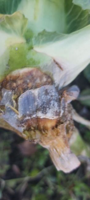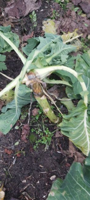 16. Een bloemkool en drie rode kolen hebben een rot stuk stam juist onder de bladeren, een stuk boven de grond. Bij mijn neef staan er zo 12. Een rij heeft het en die ernaast niet. Weet soms iemand hoe dit komt, is de eerste keer dat ik dit zie.