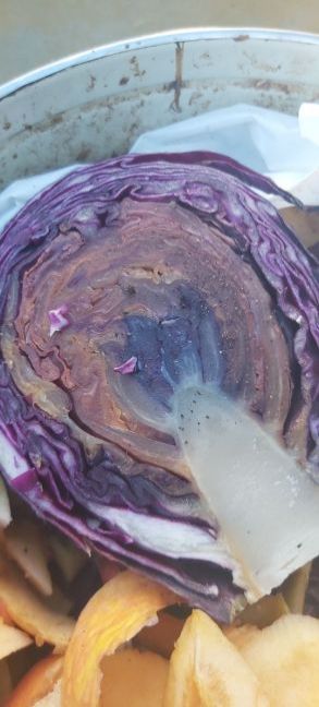14. Rode kool doorgesneden. En er is toch pluizige schimmel te zien op de bloemkoolstam.