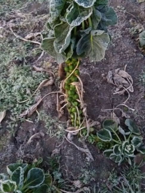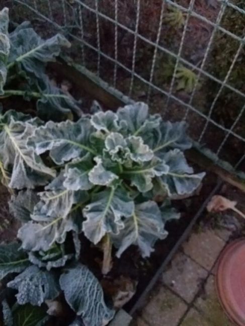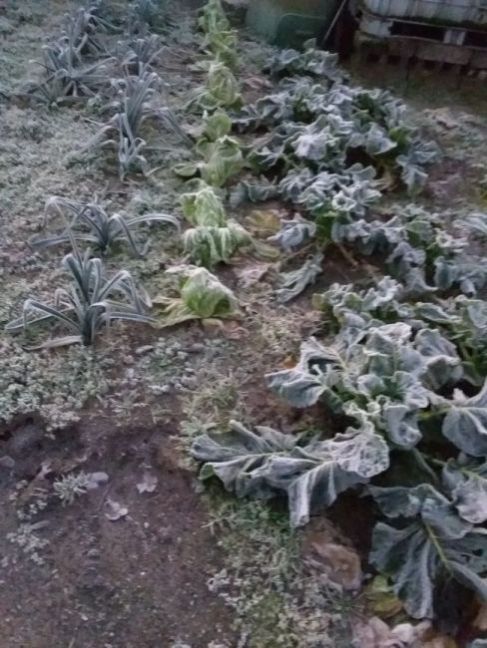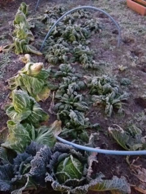 12. Wij kunnen nog veel uit de tuin eten, spinazie, suikerij, savooi en spruitjes, witloof staat binnen en de vroege bloemkool begint te draaien. Maar veel harder dan nu -4,5⁰ moet het niet gaan vriezen.