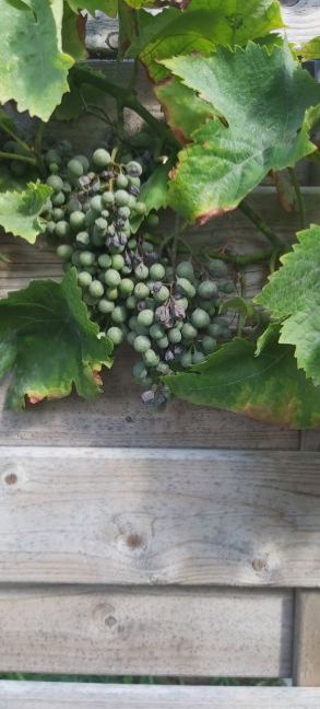 Bij mijn zus zien de druiven er zo uit als op de foto. Ze zijn ook steenhard en het lijkt er op dat ze niet eetbaar worden. Deze druif werd verkocht als "Vondeling"
