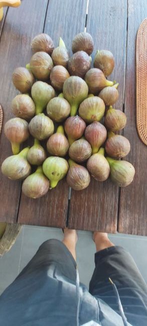 Mijn oogst van deze morgen. De vijgen plukken voordat de wespen wakker zijn, dan ziet ge enkel die dat in de vijgen geslapen hebben en meestal zijn ze dan stomdronken. Ik kan die met de hand doodknijpen.