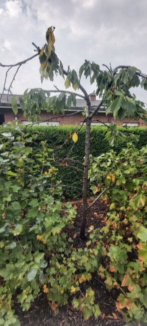 Een van mijn kerselaars, Bigarreau Napoleon, is ook ziek. Bloesemmonillia? Op aanraden van een forumlid heb ik die tijdens de droogte wel water gegeven. Veel heeft dat niet geholpen. Een paar takken hebben nog groene bladeren. De wespen hebben al de vruchten opgevreten, heb er geen enkele kunnen van eten.