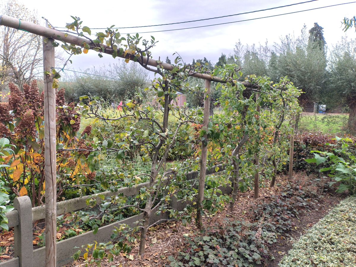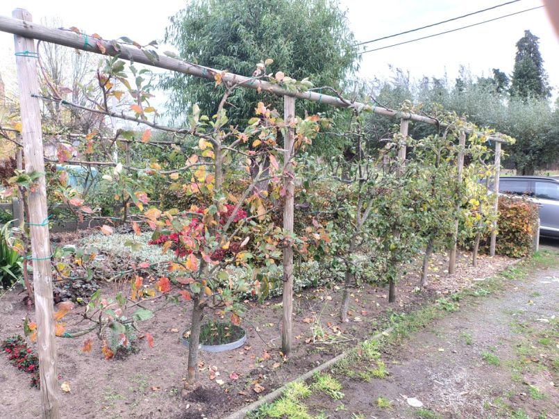 Beloofde foto's van wat ik met haag bedoeld. Langs de oprit 4 appels: Land de buren 3 appels beiden in voortuin Zijn aangekochte laagstammen. In najaar 2018 . Nu zou ik ze zelf enten. Laagste takken vrij hoog 65cm en ent naar mijn zin te laag . Met mulchun met hakselhout komt ent er onder te zitten . Volgens mij zeker niet aan te raden . Bij zelf enten : ent hoger en laagste takken iets lager . In plaats van Houten staken en latten zou ik nu gaan voor ijzeren afsluiting met bovenbuis. En daar dan spandraden tussen waar takken worden aan vast worden gemaakt voor ze te leiden. Max hoogte ongeveer 2m (ongeveer zelfde hoogte van de beuken haag) bij hoger hebben buren er schaduw van is op het zuiden van hun tuin in lengte van onze tuinen. Zeer interessante suggesties al tussen de opmerkingen waarvoor dank.