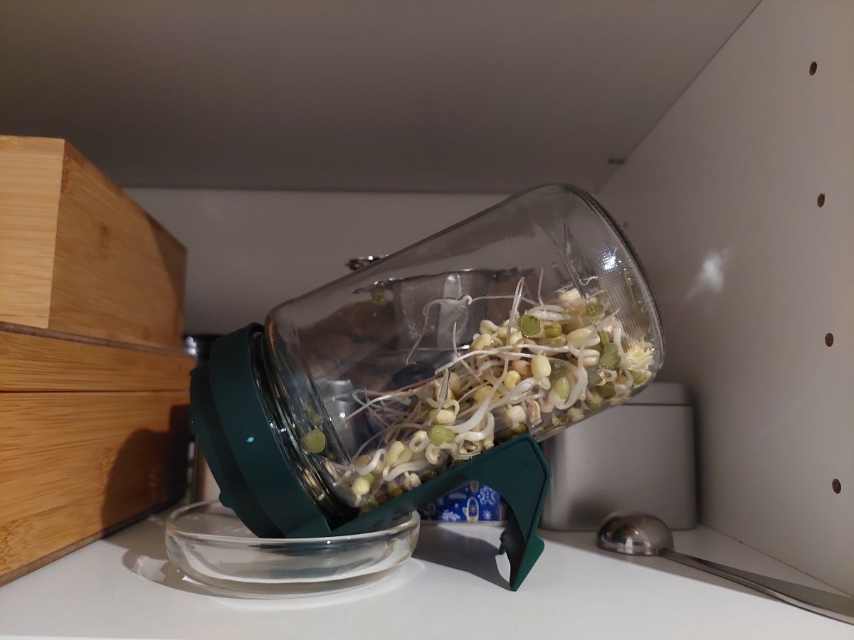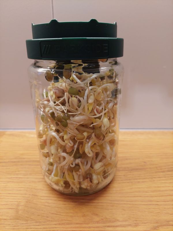 Winter is voor mij altijd tijd voor kiemgroente en dit leek mij het beste topic om alle kiemgroentes te verzamelen. Het bekende kiemschaaltje met wat tuinkers. Het rooster staat nu helemaal onder water om de zaden te weken. Vanaf morgen 1x per dag water verversen tot net onder het rooster. Voor taugé gebruik ik een kiempot (ooit bij de Lidl gekocht) en daarin gaat 1 eetlepel mungbonen. Dat lijkt heel weinig maar dat is echt genoeg. De boontjes even schoonspoelen. Pot vullen met water en 1 nacht laten weken. Vanaf morgen sochtends en savonds spoelen, goed laten uitlekken en donker wegzetten. Na 5-7 dagen heb ik een pot vol taugé. Hier nog een uitgebreider stappenplan voor taugé: https://depeuleschil.nl/thuiskiemen/kweekmethodes/weckpot-methode/