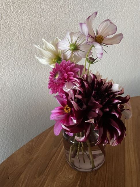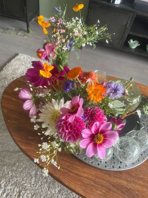Ik ga in elk geval voor de zonnehoed, cosmea, zonnebloemen, leeuwenbek en heb diverse dahlia’s staan. Verder zaai ik vaak ook een insectenmix en pluk ik willekeurig ook van voor in de vaas (hoewel dat niet altijd per se plukbloemen zijn)