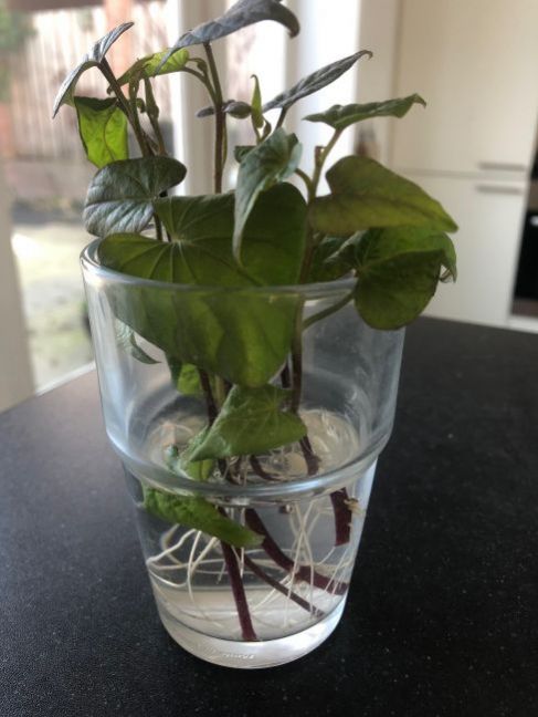 Hier hebben de zoete aardappels dit jaar weinig gedaan. Buiten stonden ze in een verdomhoekje en hebben ze het te droog gehad. De aardappels die in hetzelfde vak stonden hadden ook nagenoeg geen opbrengst. In de kas was het iets beter, maar ik vrees dat ik ook voor die planten niet goed genoeg heb gezorgd... Het was een knol van Den Oude Kastanje, ik geloof Tainung 65. Maar volgend jaar beter. Ik heb nog de laatste groene scheuten van de planten afgeknipt, in een glas water laten wortelen en opgepot. We hebben er voor de winter een paar kamerplanten bij. Daar blijf ik gedurende de winter stekken vanaf halen en oppotten (om niet te grote planten te krijgen) om zo in het voorjaar weer een paar planten te hebben. Of het lukt weet ik niet, maar als ik regelmatig jonge stekken knip en deze weer opkweek, moet ik de hele winter planten houden waardoor ik in het voorjaar ergens weer stekken vanaf kan knippen lijkt me. Zo staat een van de planten er nu bij, deze kan binnenkort gestekt worden: