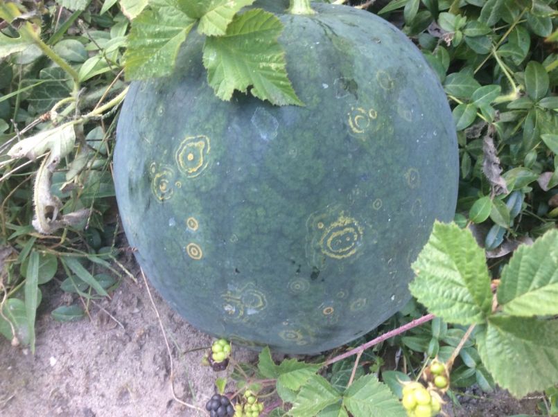 2. Op mijn watermeloenen (sugar baby) vormen zich sinds de afgelopen 3 weken gele kringen. Heeft iemand enig idee wat dit is? Een schimmel of wellicht is er een slak bezig geweest die een hap uit de schil van de watermeloen wou nemen ? 😏