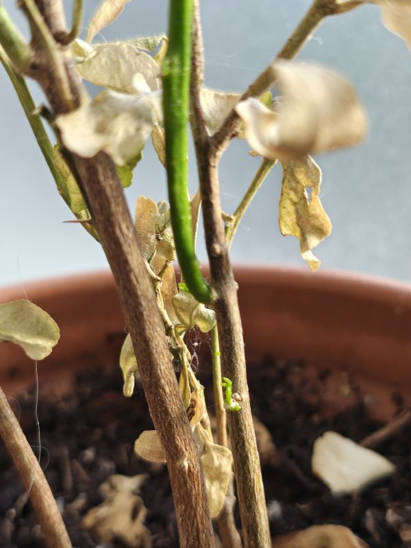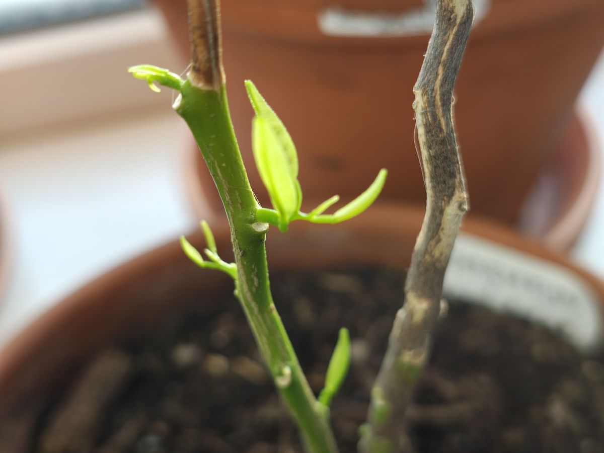 Ik was afgelopen herfst/winter te laat met het binnenhalen van de citrussen. Stomme ik 😐 Ze kregen een flinke tik van de nachtvorst en ik vreesde het ergste. Maar inmiddels is gebleken dat de mandarijnen (zelf gezaaid uit winkelmandarijn) er geen probleem mee hadden. De ene had zelfs geen bladverlies en de andere die kaal is maakt weer nieuw blad aan. Ook de fingerlime heeft nieuw blad. Ik hou mijn vingers nog even gekruist voor de djeroek poeroet. Die leek afgestorven, maar inmiddels zie ik toch nog wat verse groene uitlopers en wat blad 🤞