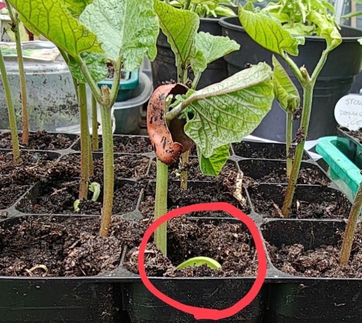 Welke bonen @Lia56? Voor tuinbonen is het nu inderdaad wel te laat. Droogbonen, snijbonen, pronkbonen en sperziebonen kunnen allemaal nog. Voor wie het leuk vindt, hier nog twee foto's waarop je het verschil tussen pronkbonen en andere bonen kunt zien als je het naamkaartje weer eens kwijt bent. Bij pronkbonen (phaseolus coccineus) blijven de kiemlobben ondergronds, bij de andere bonen (p. vulgaris) een stukje bovengronds.