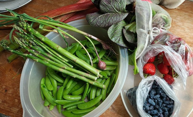 Sugar snaps, rabarber, honingbessen en aardbeien, asperges, wat per ongeluk gerooide knoflook, en prachtige rode tatsoi en handjevol gemengde sla.